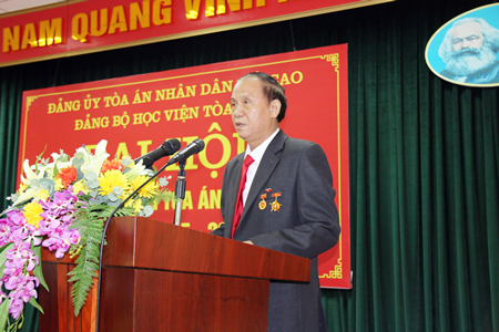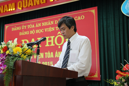 Đồng chí Trần Văn Hà, thay mặt Ban chấp hành Đảng bộ Học viện Tòa án nhiệm kỳ 2015 – 2020 phát biểu nhận nhiệm vụ tại Đại hội.