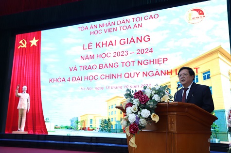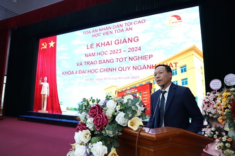Phát biểu khai giảng năm học 2023-2024 và chúc mừng 245 tân cử nhân khóa 4, PGS.TS. Phạm Minh Tuyên, Bí thư Đảng ủy, Giám đốc Học viện Tòa án đánh giá với sự cố gắng của thầy và trò, trong năm học 2022 - 2023, Học viện Tòa án đã hoàn thành xuất sắc nhiệm vụ, bảo đảm kế hoạch, chất lượng giảng dạy. Đối với các tân sinh viên khóa 8 đại học chính quy, PGS.TS. Phạm Minh Tuyên nhắn nhủ toàn thể sinh viên cần nghiêm túc học tập, rèn luyện, tích cực tham gia các hoạt động văn hóa, nghệ thuật, thể dục, thể thao và tìm đến thế giới của sách, tránh các tệ nạn xã hội… Các sinh viên cần giữ vững ngọn lửa đam mê và niềm nhiệt huyết trong màu áo của Học viện Tòa án, thể hiện bản lĩnh, ý chí, nghị lực và có mục tiêu tốt đẹp, kiên trì, nuôi dưỡng niềm đam mê của mình để trở thành những Thẩm phán tương lai với sứ mệnh bảo vệ công lý. Các tân cử nhân khóa 4 đại học chính quy cần tiếp tục rèn luyện, trau dồi kỹ năng, tu dưỡng đạo đức để sẵn sàng là đội ngũ bổ sung nhân lực cho hệ thống Tòa án nhân dân.