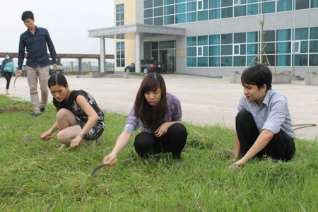 Đoàn viên tham gia cắt cỏ xung quanh khuôn viên Trường