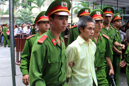 Bị tuyên án chung thân, Thành lặng lẽ bước lên xe bịt bùng về trại giam. Sau hai tháng bị tạm giữ, gã thợ sơn trông tiều tụy, tốc đốm bạc. Ảnh: Nguyễn Đông