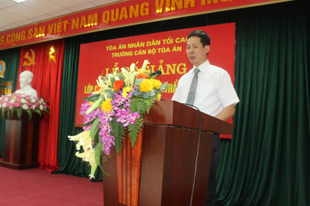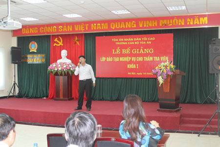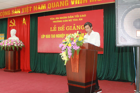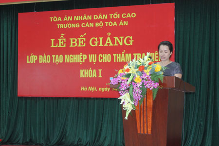 Thay mặt Ban Giám hiệu nhà Trường, đồng chí Chu Xuân Minh, Hiệu trưởng đã cảm ơn sự quan tâm, chỉ đạo của Lãnh đạo TANDTC, sự hợp tác chặt chẽ của Vụ Tổ chức - Cán bộ và sự tham gia tích cực của đội ngũ giảng viên có năng lực chuyên môn cao, nhiệt tình, trách nhiệm cùng nhà trường trong công tác giảng dạy. Hiệu trưởng Chu Xuân Minh khẳng định, thời gian tới, nhà trường sẽ cố gắng khắc phục khó khăn, tháo gỡ kịp thời những bất cập từ khóa đào tạo đầu tiên này để chuẩn bị tốt hơn cho các khóa đào tạo sau. Đồng chí chúc mừng các học viên "đã có nhiều kỷ niệm đáng nhớ" bởi là những người đầu tiên tham gia chương trình đào tạo nghiệp vụ xét xử - Thẩm tra viên. Đồng chí cũng chia sẻ: Đây là khóa đào tạo đầu tiên nên công tác soạn thảo giáo trình, tổ chức giảng dạy còn có những bất cập, hạn chế, nhưng nhà Trường đã huy động được lực lượng giảng viên là những người có kinh nghiệm xét xử nhiều năm trong ngành tham gia nên chắc chắn chương trình đào tạo đã đáp ứng được những yêu cầu cơ bản nhất. Đồng chí hy vọng các học viên sẽ tham gia đóng góp ý kiến nhiều hơn nữa cho nhà trường để nhà trường tổ chức các khóa đào tạo sau được hiệu quả hơn.