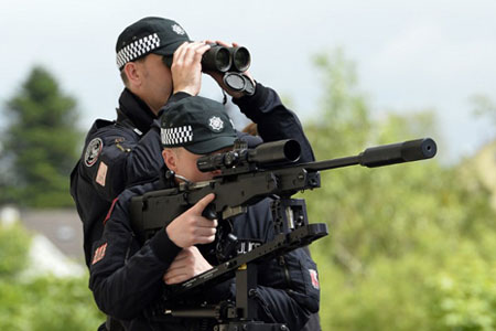 Cảnh sát chống bắn tỉa đang rà soát một khu vực khi Tổng thống Mỹ Barack Obama và Thủ tướng Anh David Cameron tới một ngôi trường ở Enniskillen, Bắc Ireland, hôm nay. Ảnh: AFP