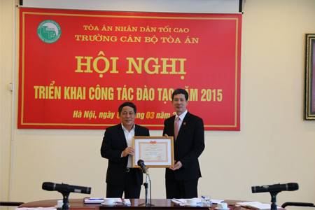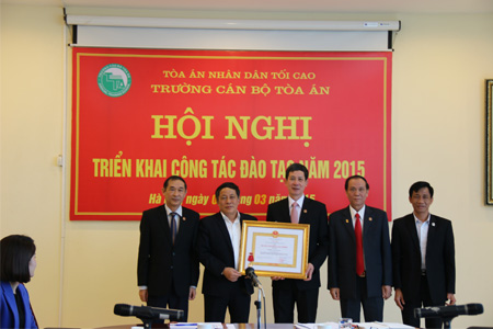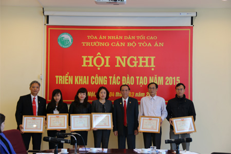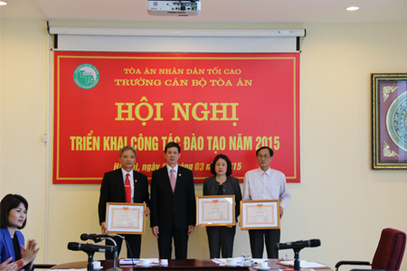 Đồng thời Phó Hiệu trưởng Nguyễn Đức An đã công bố các Quyết định khen thưởng của Chủ tịch nước và Chánh án TANDTC đối với Trường Cán bộ Tòa án và các tập thể, cá nhân được khen thưởng trong năm 2014. Thay mặt lãnh đạo TANDTC, Phó Chánh án Nguyễn Văn Thuân đã trao tặng Huân chương Lao động hạng Ba cho nhà Trường, đồng thời trao danh hiệu thi đua cho các tập thể, cá nhân đã có thành tích xuất sắc trong công tác năm 2014.