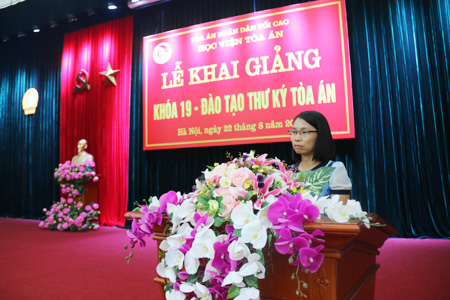 Thay mặt cho 82 học viên đến từ Tòa án nhân dân hai cấp của 09 tỉnh phía Nam, học viên Trịnh Thị Biên - Thư ký Tòa án nhân dân tỉnh Khánh Hòa đã gửi lời cảm ơn tới lãnh đạo TAND tối cao, lãnh đạo, cán bộ công chức Học viện Tòa án đã quan tâm, chỉ đạo, chuẩn bị tốt về mọi mặt để tổ chức thành công khóa học và cũng bày tỏ quyết tâm tham gia khóa học với tinh thần nghiêm túc, tích cực học tập để hoàn thành tốt khóa học với kết quả cao nhất.